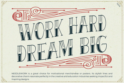 This font balances modern and classic design elements, making it versatile for various projects. It works well in headlines, logos, and posters where a bold impact is essential. Additionally, its handcrafted look pairs beautifully with both minimalistic and elaborate compositions. Whether used for print or digital media, Tattoo Font Needlework brings energy and personality to your designs.