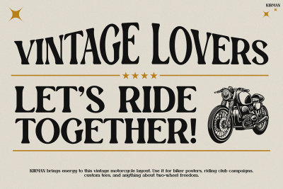Vintage Font KIRMAN blends style and function in one unique typeface. Itโs perfect for designers who love bold and nostalgic looks. Because of its classic charm, it enhances branding, posters, merchandise, and more.