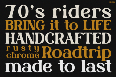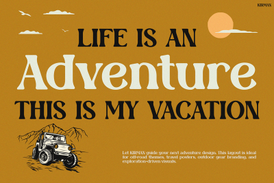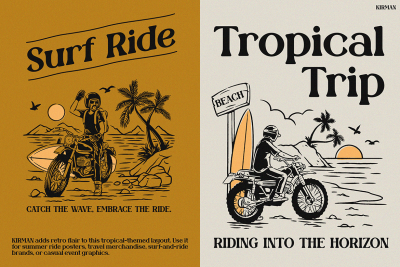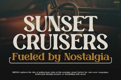 Moreover, KIRMAN is more than just good looks. Itโs built for versatility. Thanks to its clear letterforms, itโs easy to read in both print and digital formats. Whether you’re recreating vintage motorcycle culture or designing tropical surf visuals, this font fits the vibe. In short, KIRMAN is a tool for creative storytelling.